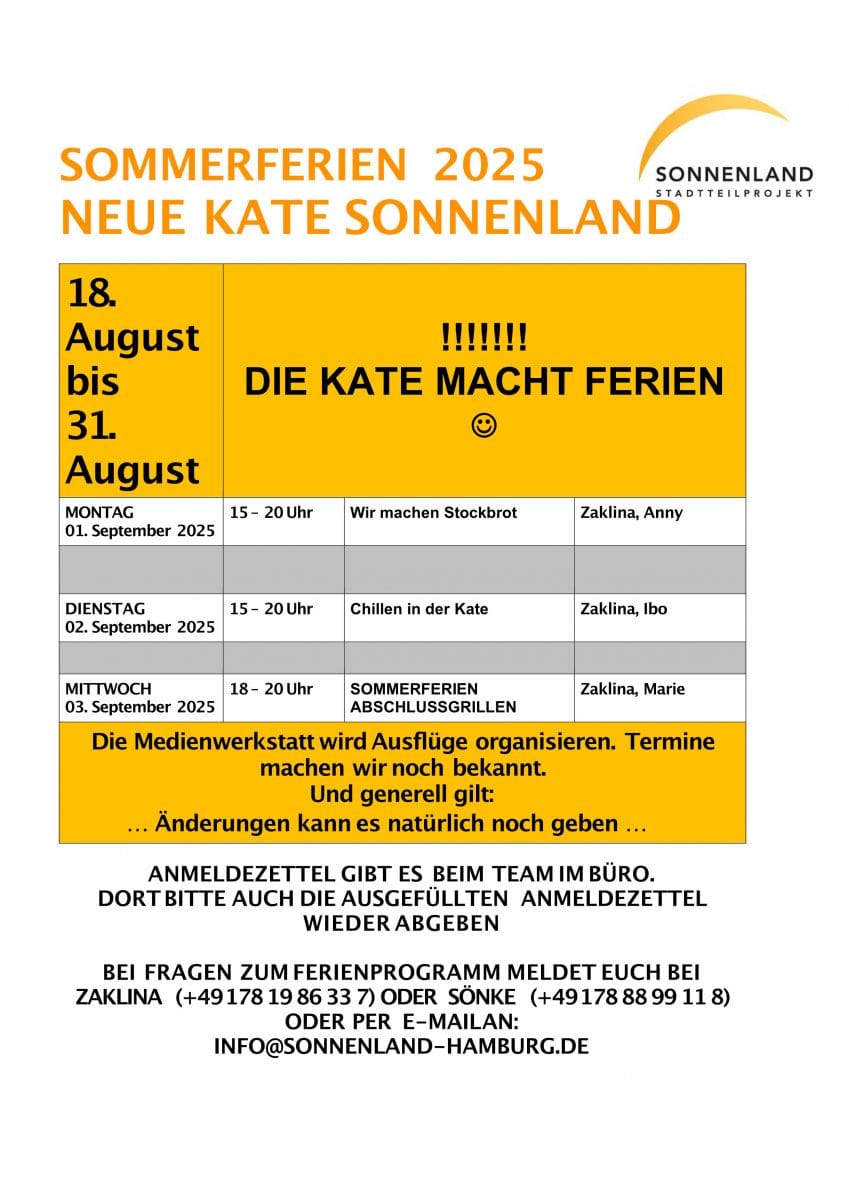 Bei Fragen zum Ferienprogramm meldet euch beiZalina (Tel.:+49 178 19 86 33 7) oder Sönke (Tel.: 0178 88 99 11 8)oder info@sonnenland-hamburg.de Die