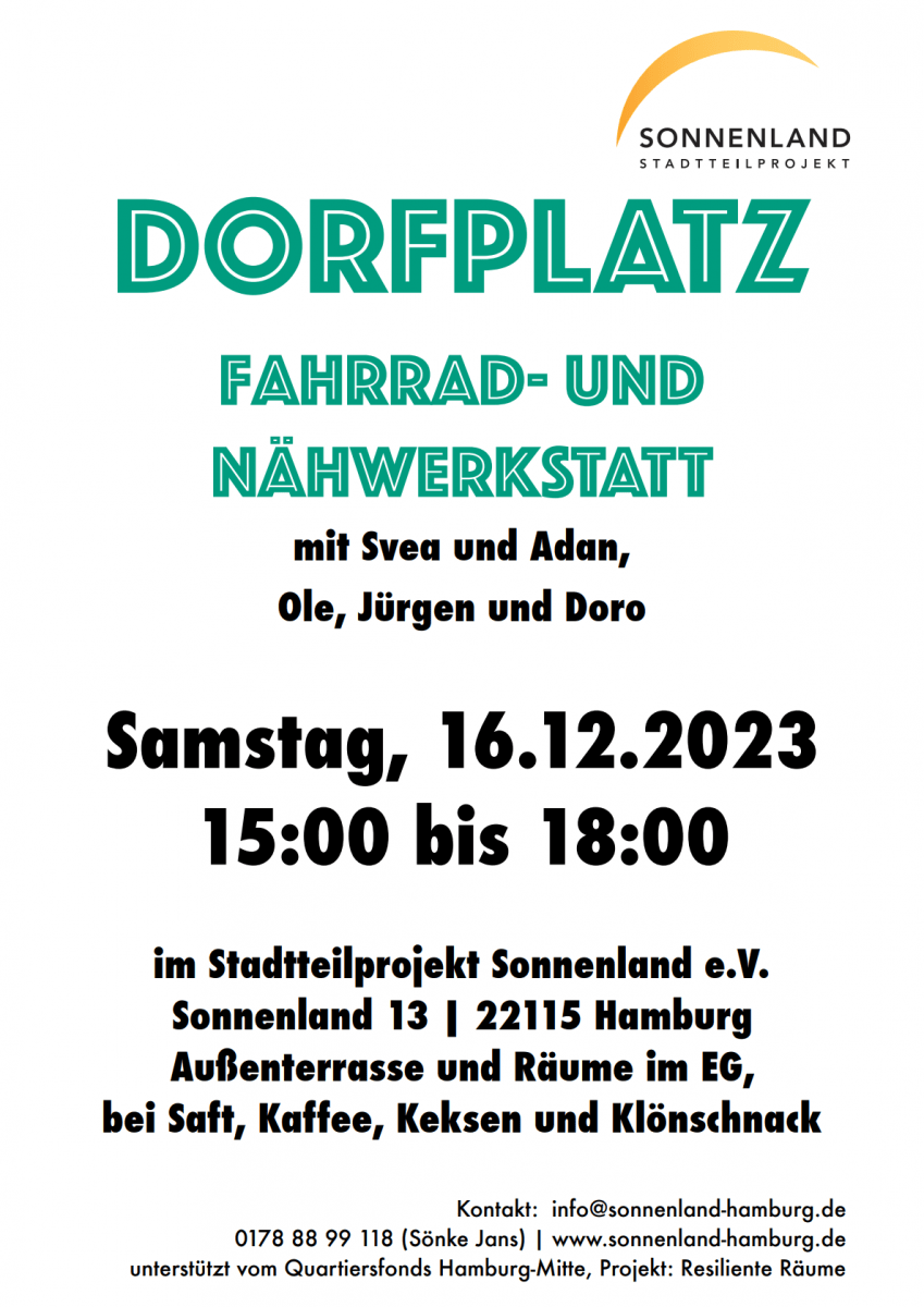 sa16dez15:0018:00Dorfplatz: Fahrrad- und NähwerkstattDorfplatz Sonnenland