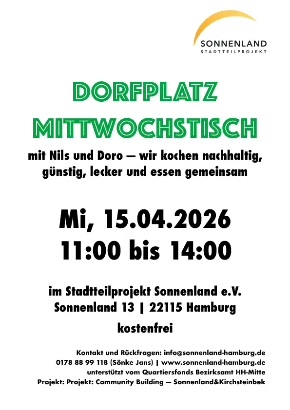 mi15apr11:0014:00Dorfplatz: MittwochstischDorfplatz Sonnenland