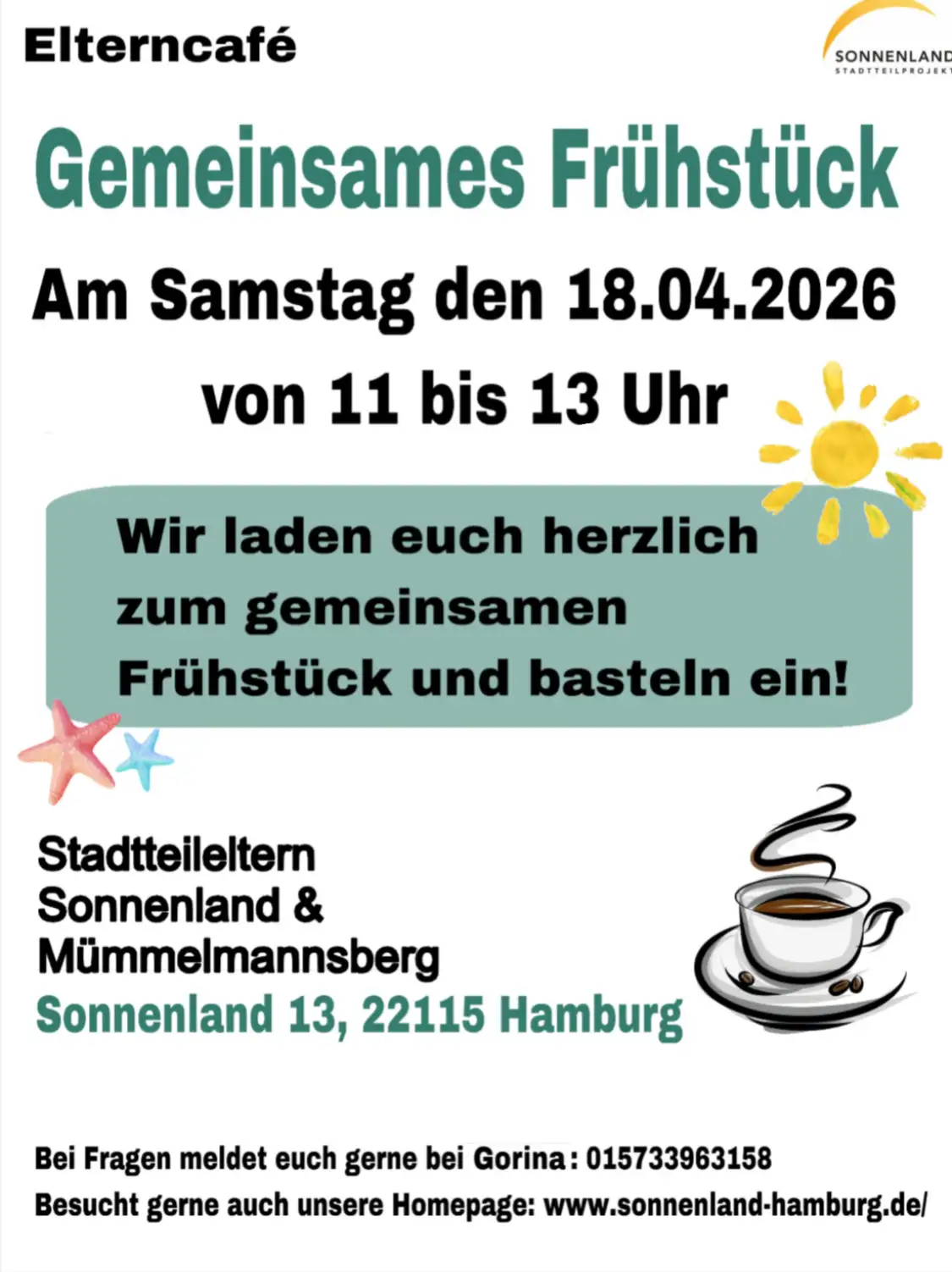Die Stadtteileltern Sonnenland&Mümmelmannsberg laden euch ein zum gemeinsamen Frühstück und Austausch.