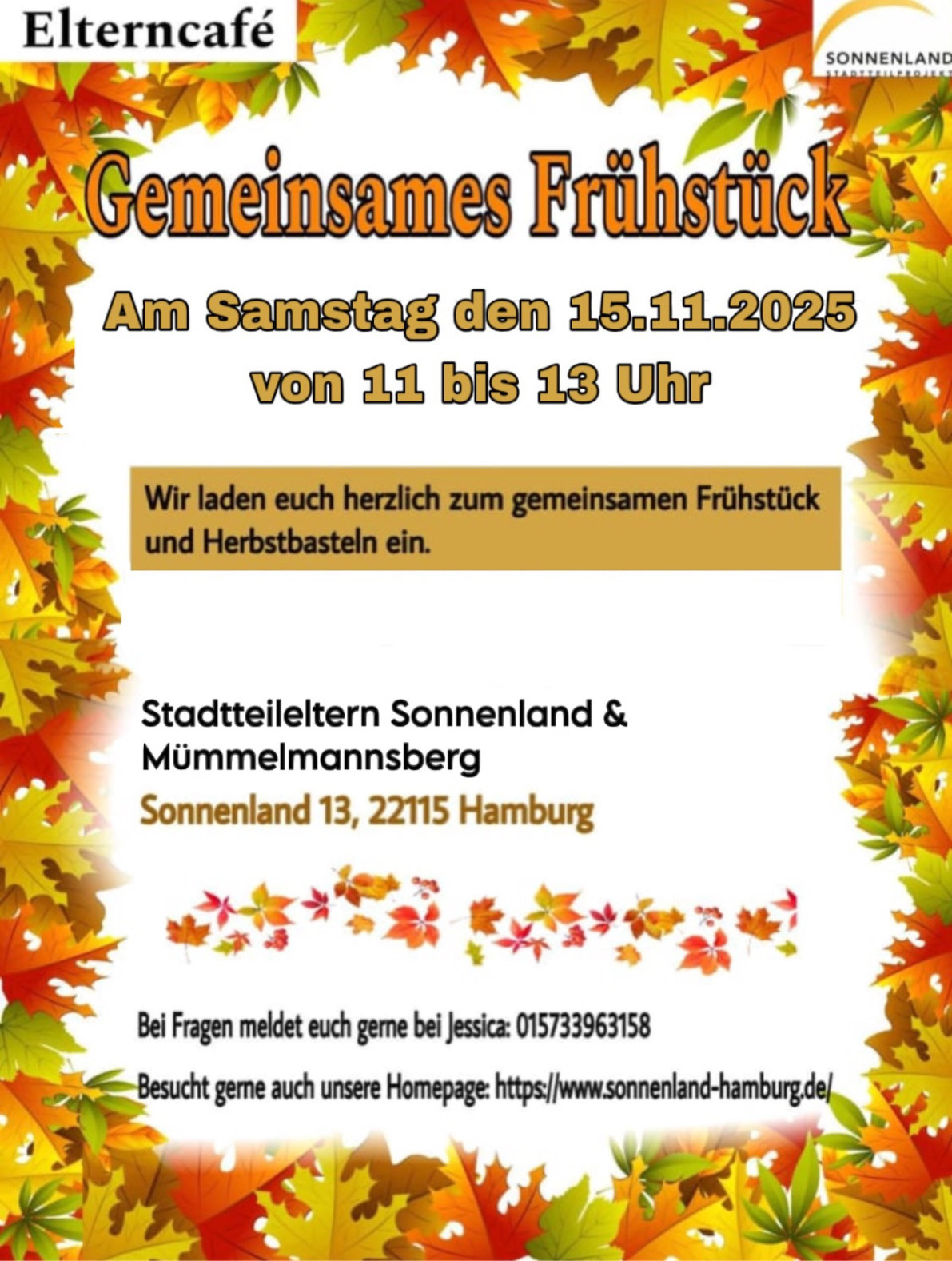 Die Stadtteileltern Sonnenland&Mümmelmannsberg laden euch ein zum gemeinsamen Frühstück und Austausch. Wann? Am 15.11. von 11 bis 13 Uhr