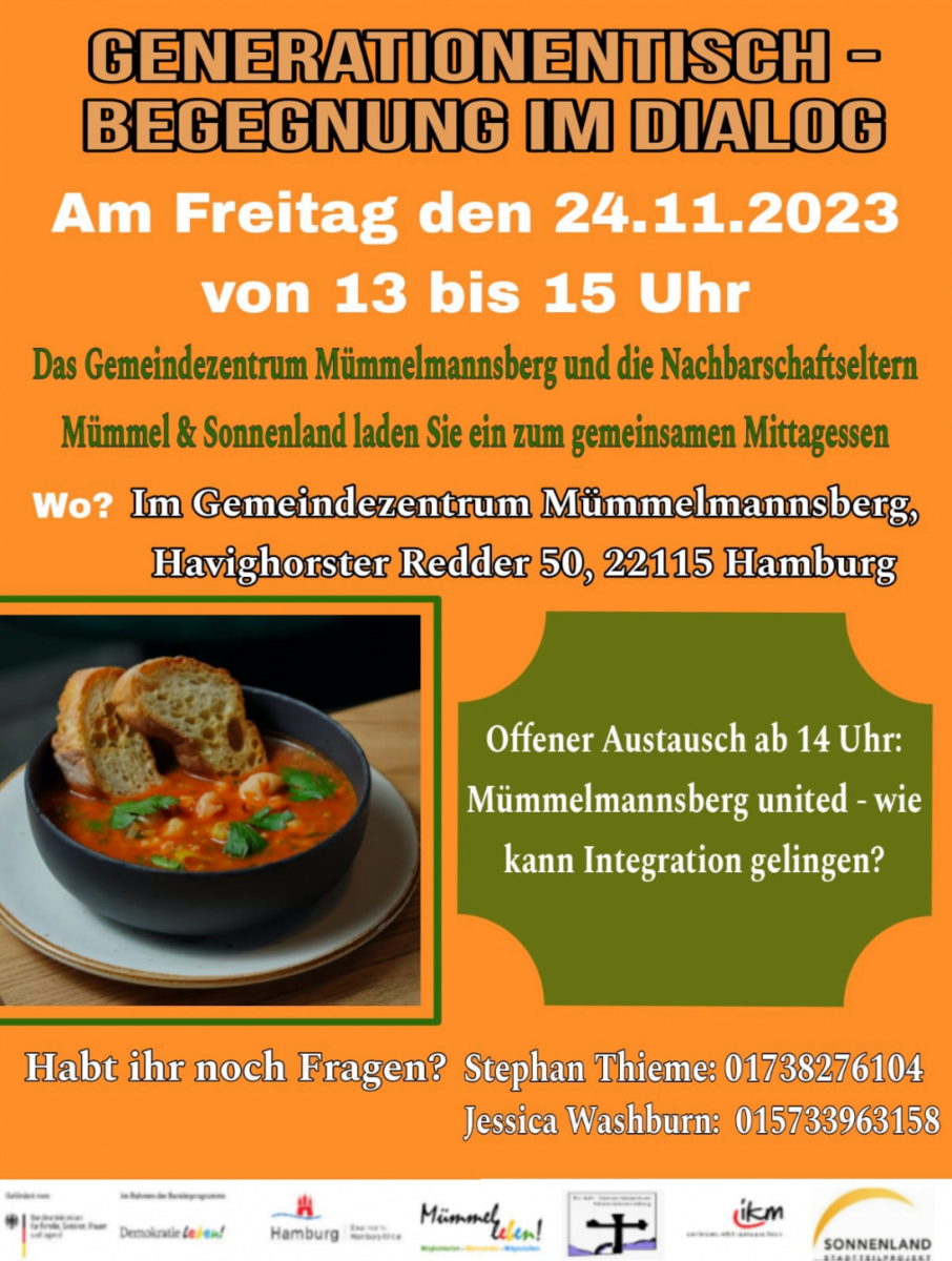 Das Gemeindezentrum Mümmelmannsberg und die Nachbarschaftseltern Mümmel&Sonnenland laden ein zum monatlich statt findenden Generationentisch – Begegnung im Dialog (Immer wechselnd Freitag oder Samstag).