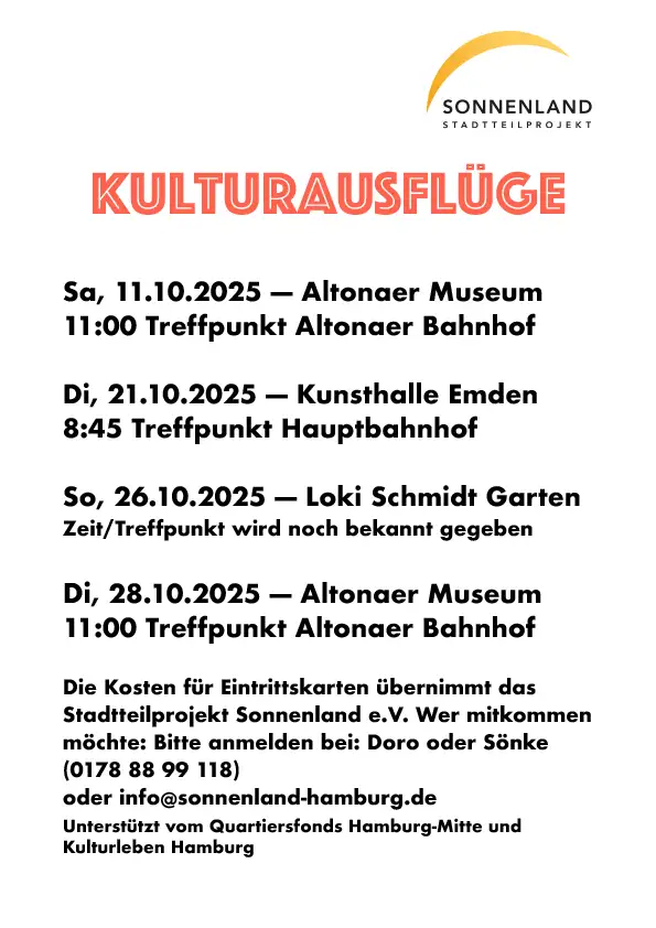 So, 26.10.2025 — Loki Schmidt GartenZeit/Treffpunkt wird noch bekannt gegeben Die Kosten für Eintrittskarten übernimmt dasStadtteilprojekt Sonnenland e.V.