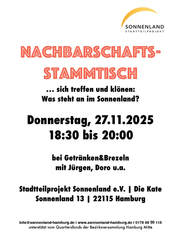 Sich treffen und klönen: Was steht an im Sonnenland? Der Nachbarschafts-Stammtisch ist ein offener Treffpunkt für Bewohnerinnen und Bewohner aus dem Sonnenland. Zum Planen, sich