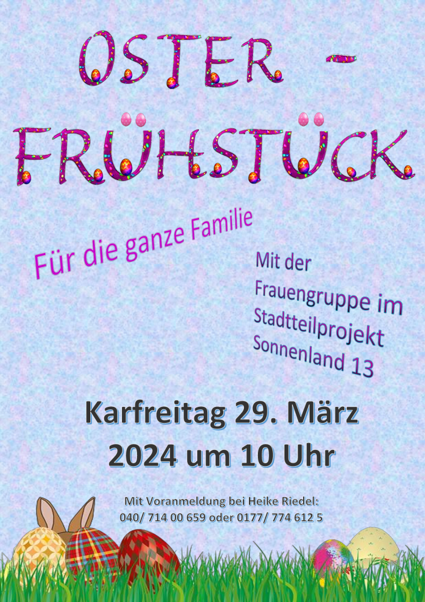Traditionell findet am Karfreitag wieder das beliebte Osterfrühstück statt- von und mit der Frauengruppe Sonnenland- und für die ganze Familie! Meldet